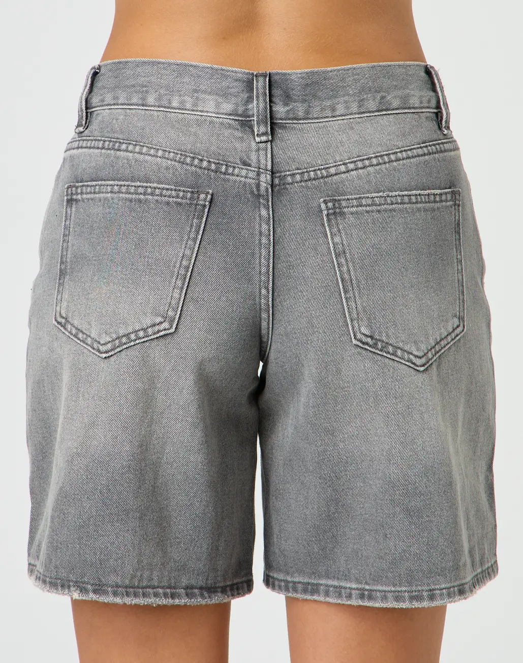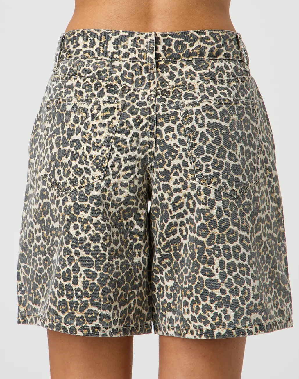 These leopard denim short feature a low rise waist, longline style, belt loops and pockets.