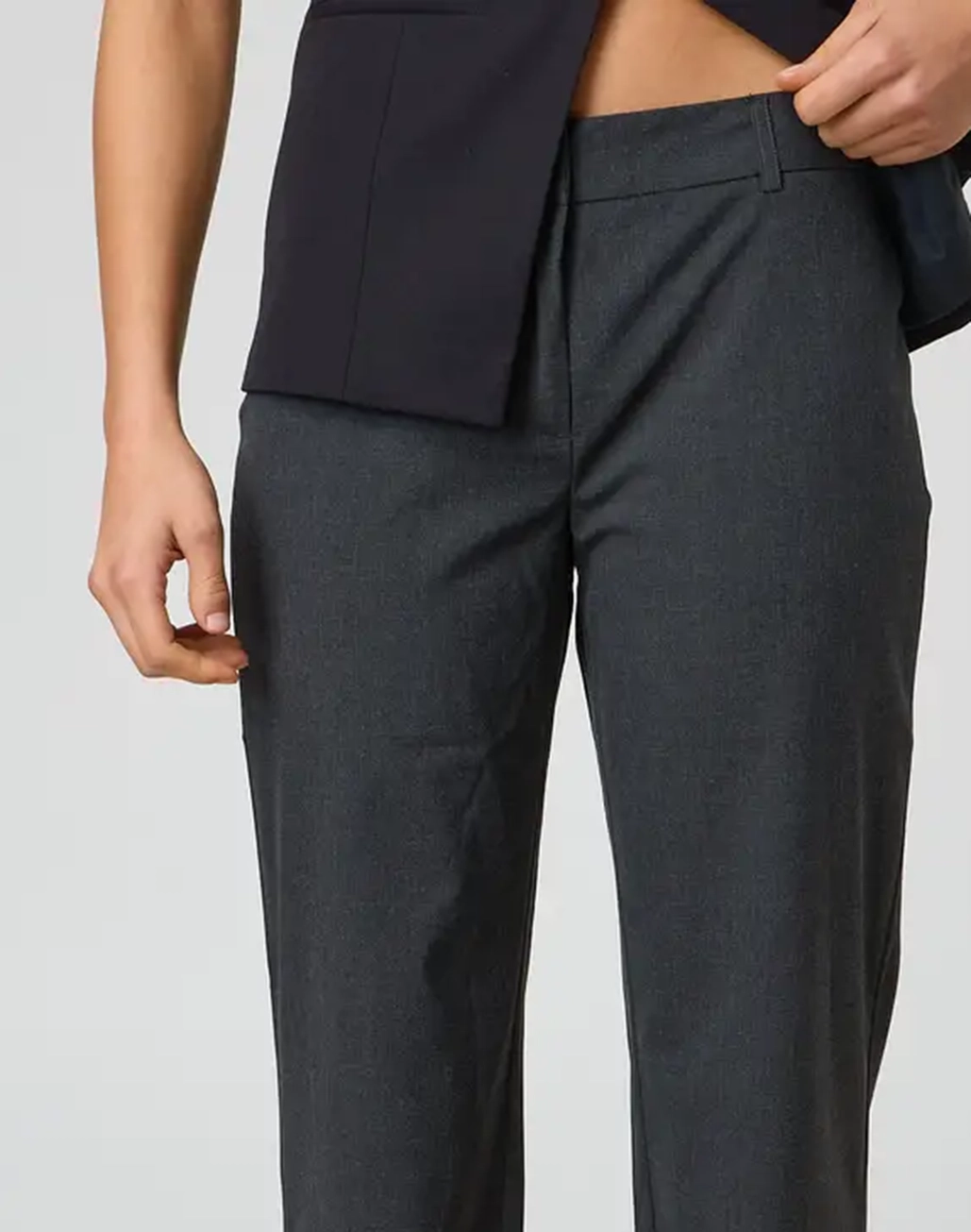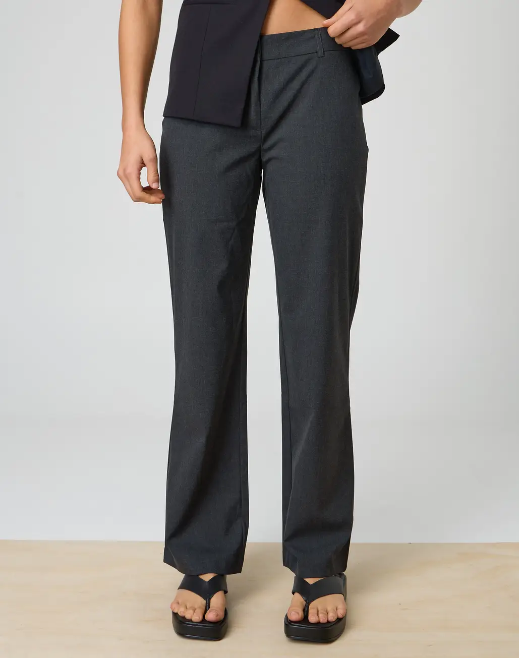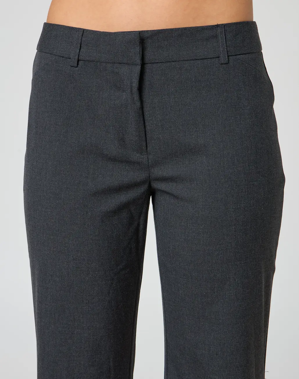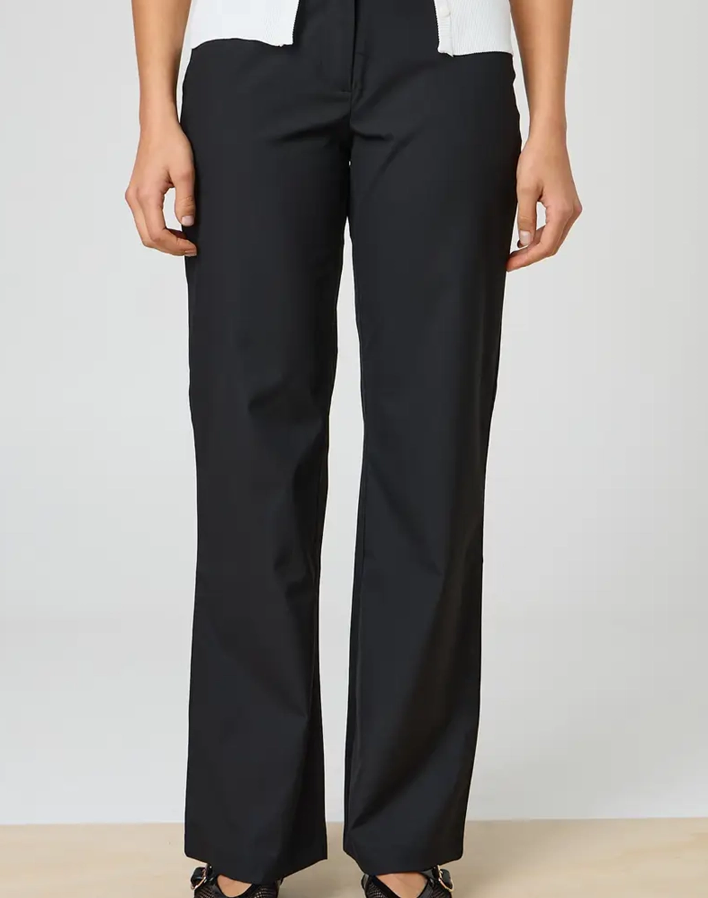 These pants feature a mid rise waist, pinstripe print, straight leg fit and zip clasp closure.